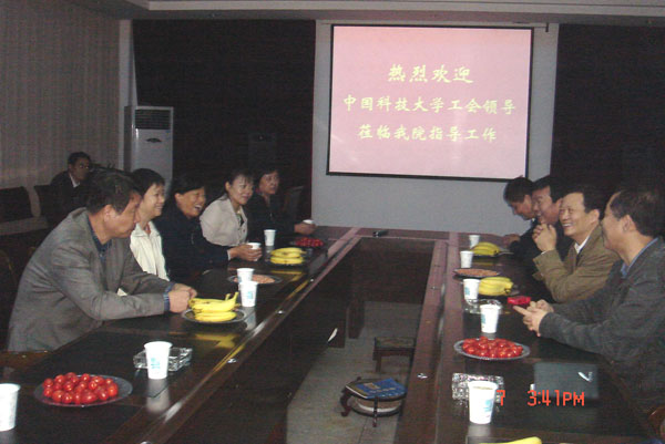 2008年11月7日下午,由中国科学技术大学工会常务副主席俞寿明率领的中国科学技术大学工会代表团来我院访问交流。我院党委书记周凯、院长亓四华、副院长聂蒯张、院长助理刘艺等接待了俞寿明副主席一行。