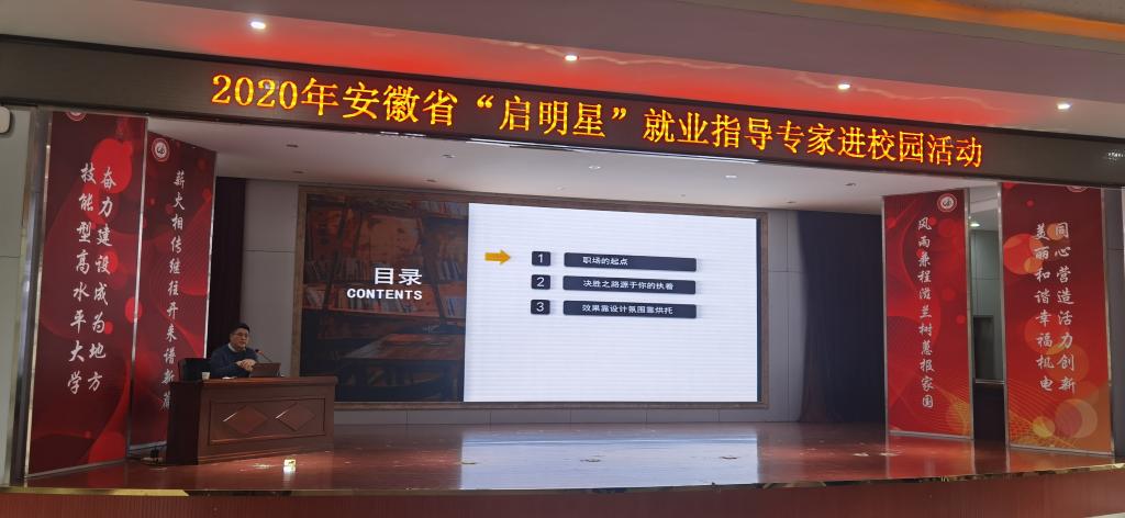 11月25日下午,由安徽省人才服务中心、安徽省大中专就业指导中心主办,我校招生就业处承办的“省级‘启明星’就业指导专家进校园”活动在学校综合楼一楼报告厅如期开展。活动邀请省级“启明星”就业指导专家团成员、安徽省人力资源管理协会秘书长王永胜,为毕业生和部份大二在校生作题为《飞驰的人生——就业指导和职业生涯规划》讲座。创新创业与职业发展教研室教师、部分辅导员以及300余名在校生参加本次讲座。